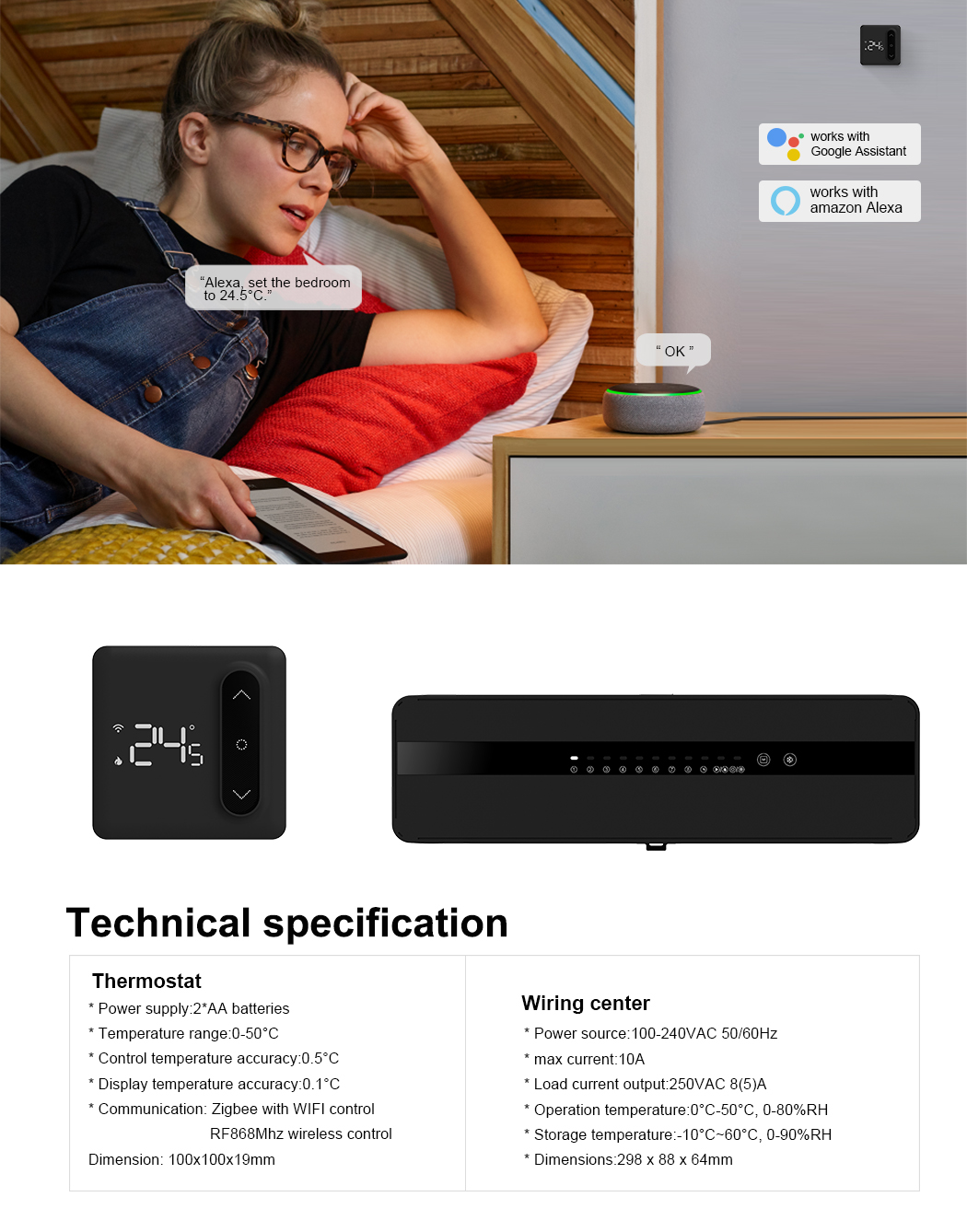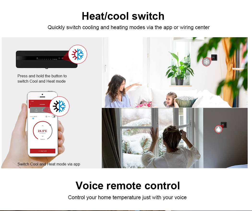 يُسهّل التصميم اللاسلكي عملية التركيب، مما يجعله مناسبًا لمشاريع البناء الجديدة والتجديد. يمكن للمستخدمين ضبط درجات الحرارة الداخلية عن بُعد عبر تطبيق جوال، مما يُعزز راحتهم وتجاربهم المعيشية الذكية. يُساعد التحكم الدقيق في درجة الحرارة على تحسين استهلاك الطاقة وخفض تكاليف التشغيل.